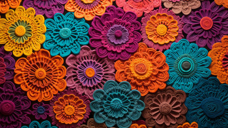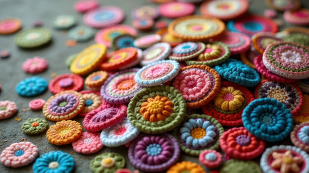 Colorful handmade crochet circles in various patterns and sizes. That the image is generated using AI.
