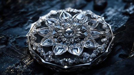 This stunning silver brooch features an intricate floral design embellished with sparkling gemstones, showcasing delicate craftsmanship against a dark background.