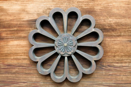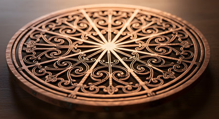 An exceptionally intricate, circular copper trivet rests on a dark wooden surface, its delicate, ornate filigree pattern beautifully highlighted. This piece showcases exquisite laser-cut craftsmanship, representing elegance, decorative art, and detailed metalwork.