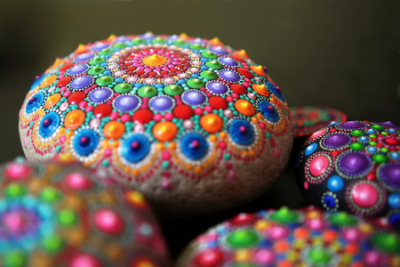 This striking image features an ornate mandala design resting on a textured stone surface. The vibrant colors and intricate details create an artistic focal point, perfect for backgrounds and creative projects.