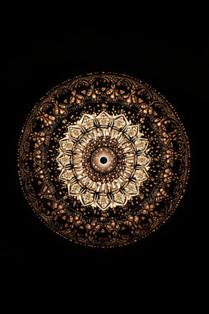 A beautifully crafted mandala featuring swirling patterns and intricate details, illuminated by a soft glow. Set against a black background, this art piece highlights the delicate craftsmanship and spiritual significance of mandalas.