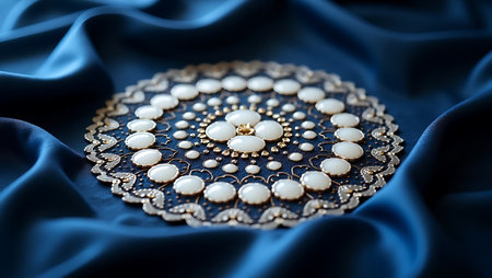 White pearl inlaid mandala on deep navy silk with soft studio lighting