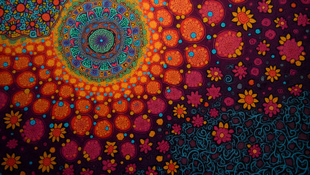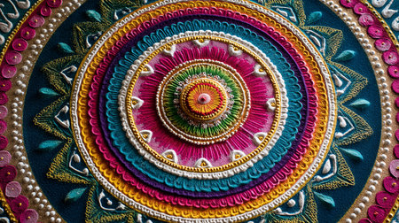 A vibrant, colorful mandala with intricate patterns and textures. The central circle features a jeweled design surrounded by radiating petals.