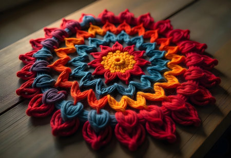 A stunning crochet mandala bursts with bright colors, showcasing intricate patterns and textures. Set against a weathered wooden backdrop, it captures the beauty of handmade art.