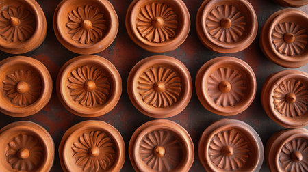 Handmade Indian clay diyas arranged in a sunlit pattern.