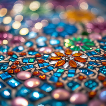 Close up of colorful glass mosaic background. Selective focus. Shallow depth of field.