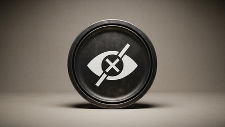A dark, metallic circular icon with a white symbol of an eye crossed out, representing privacy or invisibility.