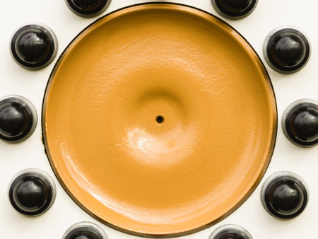 Close up of yellow detailed black bolts screws on car truck wheel. Abstract background concept.