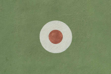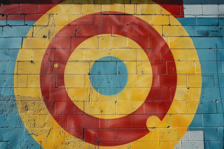 Concentric circles in red and yellow forming a target on a textured brick wall painted in blue, yellow and red