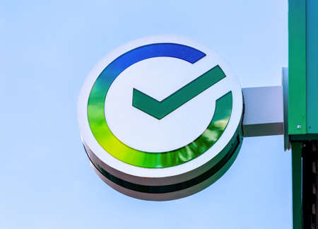 Samara, Russia - June 10, 2022: Signboard with the logo of the Sber Bank against the blue sky
