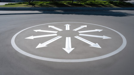 A circular road design features multiple white arrows directing traffic in various directions on a smooth paved surface, embodying urban navigation.