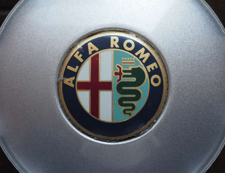 TURIN, ITALY - CIRCA AUGUST 2018: Alfa Romeo car logo on wheel covers