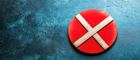 A round wooden sign featuring a red background with a white diagonal cross placed on a textured blue surface.