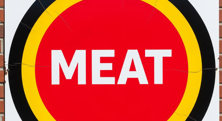 a close up of a meat sign with a red circle and white letters on a brick wall outside a restaurant