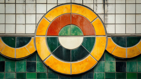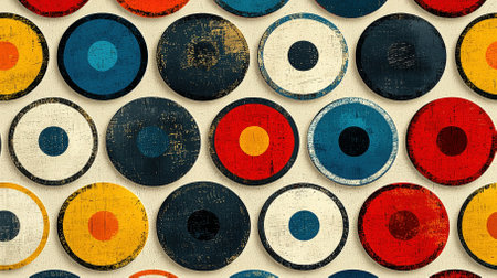 This vibrant image features a vintage circular pattern in a delightful array of retro colors on a textured background, ideal for creative projects.