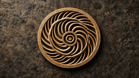 This captivating wood carving features intricate spiral patterns and a rich texture, perfect for showcasing craftsmanship and artistic design in decor.