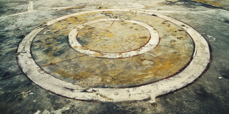 This image features a weathered circular pattern on a grungy concrete surface, showcasing intricate textures and stains for artistic and industrial themes.