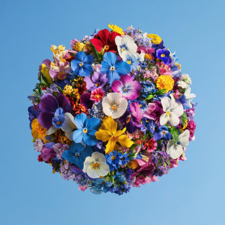A stunning arrangement of vibrant flowers forms a spherical shape, set against a bright blue sky. This captivating image showcases the beauty of nature and the diversity of floral colors, perfect for spring-themed projects