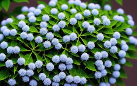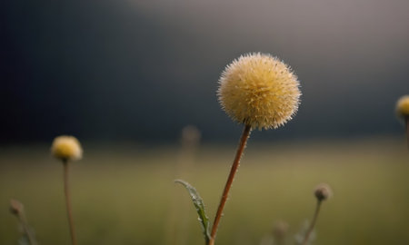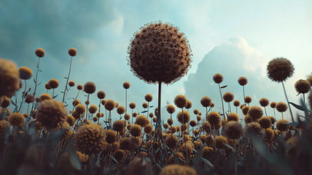 A captivating image of a field filled with spherical flowers, set against a backdrop of a cloudy sky.