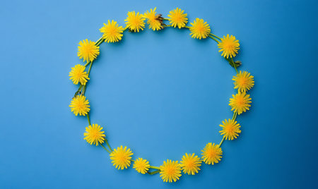 Dandelions are skillfully arranged to create an empty circle on a bright blue backdrop. This playful composition highlights the contrast of colors and the beauty of nature.