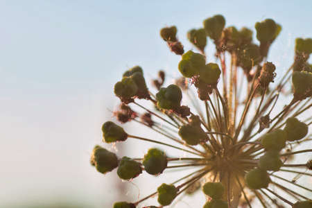Dewdrops on the onion flower buds, Onion plants produce flowers that are ready for pollination and seed production and onion has flower buds