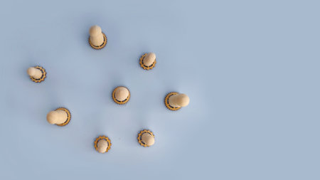 Pile of blue plastic caps from bottles isolated on blue background, concept of ocean plastic waste and pollution problem, part of the global warming and climate change crisis