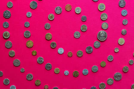 Different argentine coins stacked. Pile of money. Metal coins texture. Different denominations.