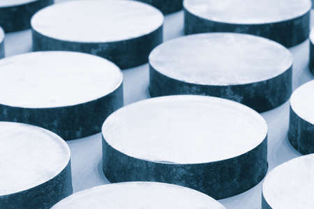 This image showcases numerous metallic circular objects of varying sizes and textured surfaces. The objects appear to be arranged on a dark surface, potentially indoors. The composition features an overhead view with soft lighting. Suitable for use in a variety of visual projects, including industrial, design, or abstract concepts.