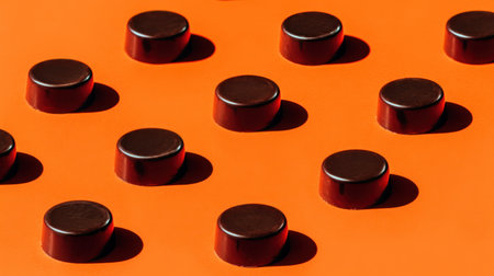 A captivating arrangement of circular chocolate treats on a vibrant orange surface creates an eye-catching visual. The playful shadows enhance the unique texture.