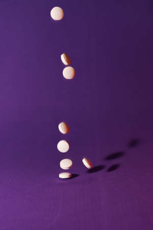 Stock photo of a bunch of pills falling down on a purple background. There is nobody on the picture.