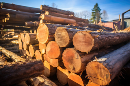 This image captures the essence of timber resources for construction and manufacturing A towering stack of logs, ready for processing at a sawmill, highlights the vital role timber plays in building our world These logs represent the foundation of homes, furniture, and countless other essential products, showcasing the importance of AI Generative