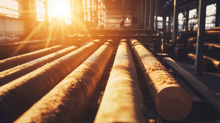 A serene morning view of wooden logs resting in an industrial warehouse, illuminated by warm sunlight streaming through windows, creating a tranquil atmosphere.