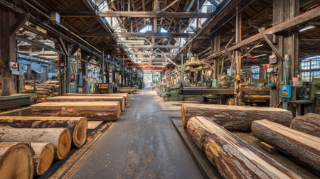 A spacious interior view of a wood processing factory showcasing logs and machinery. The environment highlights the craftsmanship involved in lumber production.