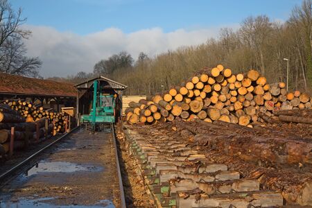 Wood raw materials at a sawmill for furniture production or timber harvesting. High quality photo