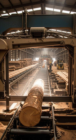 Dynamic shot of a lumber mill in operation, logs being cut into planks, focusing on the machinery and raw materials,