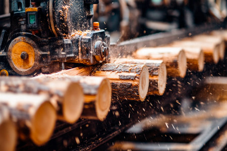 In a sawmill, machines operate efficiently to cut logs into lumber, creating sawdust and sparks in a busy industrial environment. Workers oversee the process for quality control.