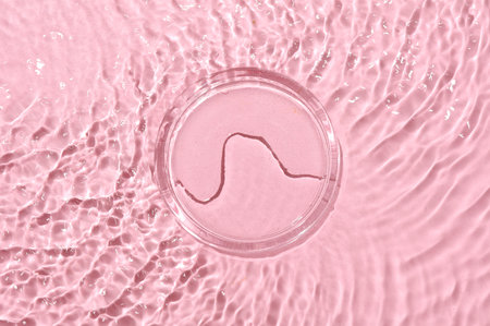 Glass round on pink background with water waves. Beauty concept