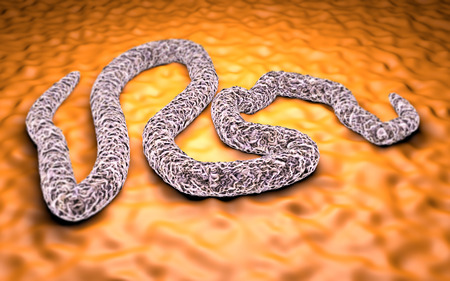 Helminths Toxocara canis dog roundworm, the cause of toxocariasis in man, an infestation transmitted from material contaminated by eggs in dogs feces. 3D illustration of a first larval stage