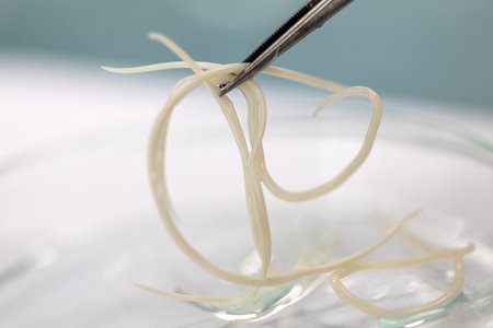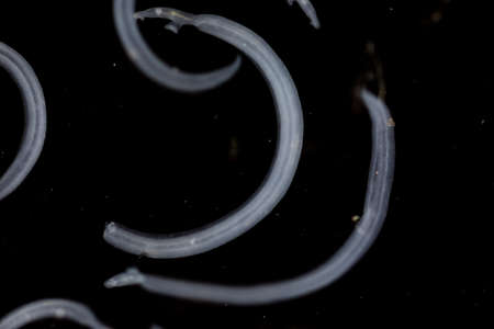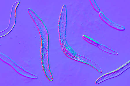 Microscopic view collection of adult free-living female Strongyloides stercoralis, a human pathogenic parasitic roundworm causing the disease strongyloidiasis.