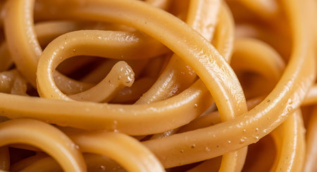 Close-up of a pile of freshly cooked noodles, ready to be enjoyed as part of a delicious meal. The image captures the texture and sheen of the noodles, highlighting their culinary appeal.