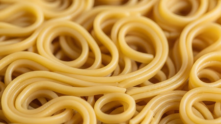 A full-frame close-up texture of cooked spaghetti pasta noodles entwined together. The golden-yellow strands create an abstract, swirling pattern that highlights the appetizing and comforting nature of carbohydrate-rich food.