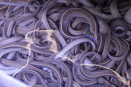 Eels fish close up in the aquarium on the fish market in South Korea