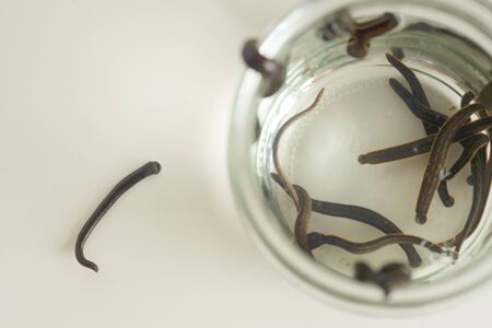 Hirudotherapy. Medical leeches in water before therapy.