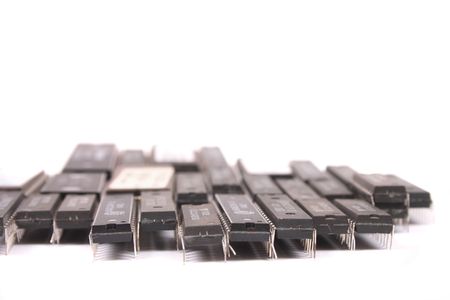 Microchips in a DIP case on a white background. A microelectronic element. Black microchips.