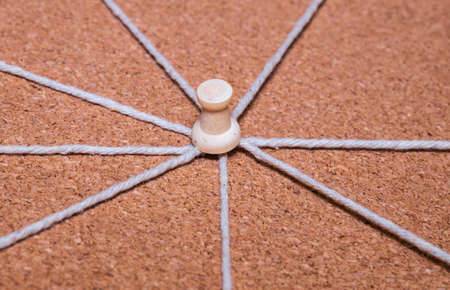 Linking entities. Network, networking, social media, connectivity, internet communication abstract. Web of threads on cork board.