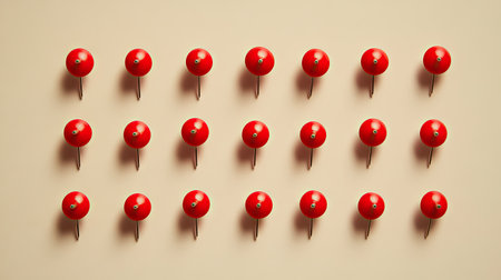 A vibrant composition of red pushpins on a reflective white surface, emphasizing their glossy texture.