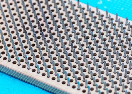 The micro elements of computer central processor unit, CPU contact pins close up.