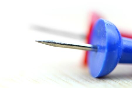 Extreme close up shot of blue and red push pins
