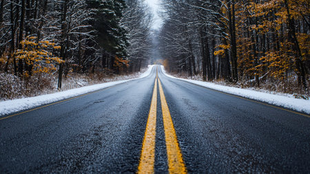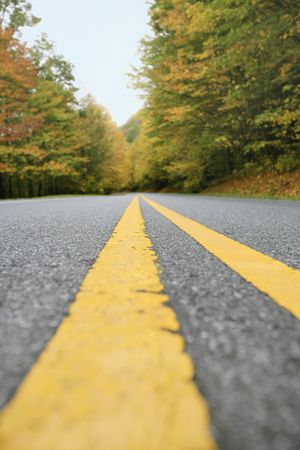 A view of a road with double yellow lines cutting through a forest. The dark asphalt contrasts with the yellow stripes, leaves, and autumnal trees. The image uses a low-angle perspective, leading the viewer into the scene with a moody, dark aesthetic. Suitable for editorial and commercial applications.