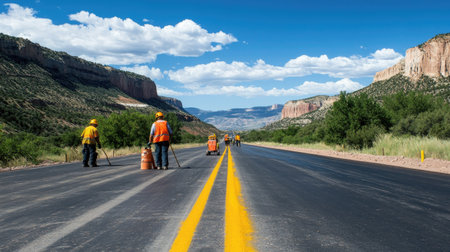 A road crew painting fresh lines on a newly repaired stretch of highway.